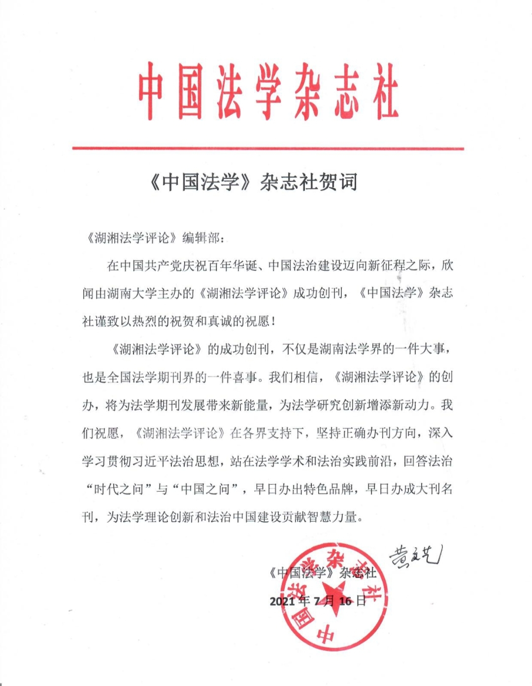 《中国法学》总编辑黄文艺教授代表《中国法学》杂志社提交了贺词。贺词指出,我们相信,《湖湘法学评论》的创办,将为法学期刊发展带来新能量,为法学研究创新增添新动力。期许新刊站在法学学术和法治实践前沿,回答法治“时代之问”与“中国之问”,早日办出特色品牌,早日办成大刊名刊。