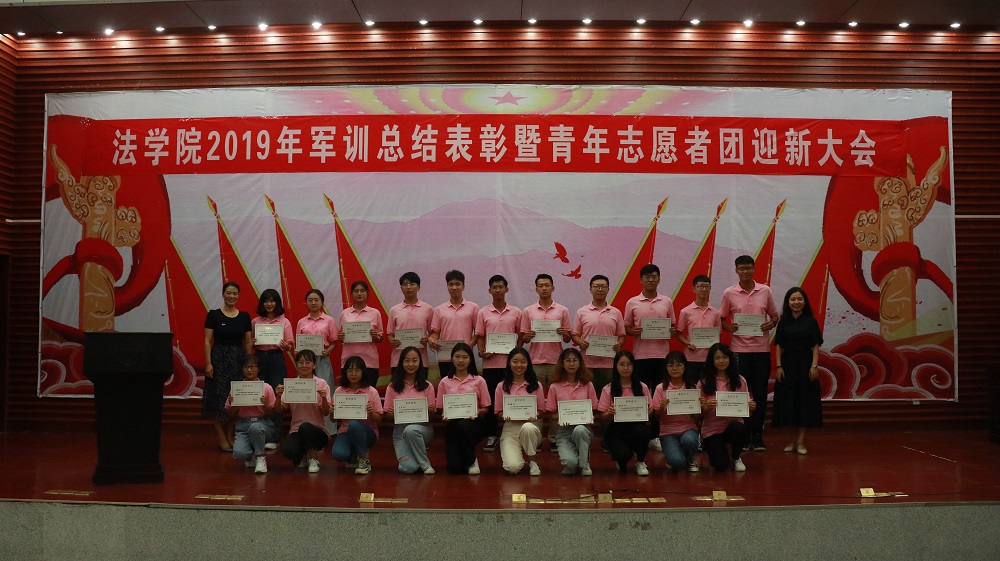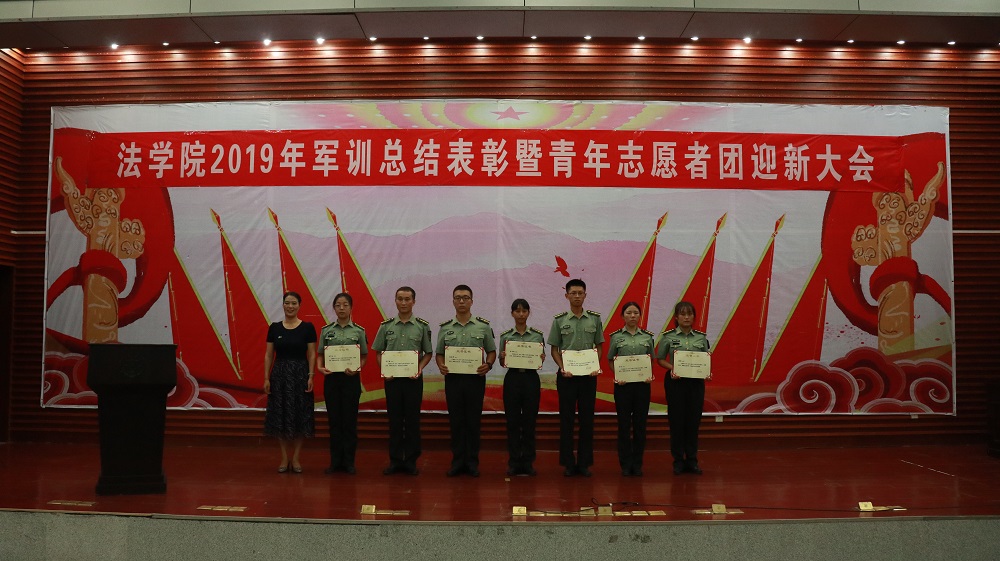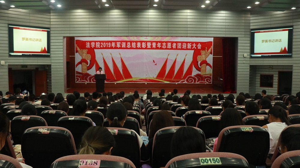 在2019年军训中取得的成绩,她向顺利完成军训任务的2019级新同学们表示祝贺,同时希望同学们能够发扬军训中吃苦耐劳、坚韧不拔的精神,把练到的本领投入到将来大学四年的学习和生活中。罗英老师还向全体同学介绍2019级本科生各班班主任。为帮助同学们更好地研习法学学科,顺利度过大学生活,学院聘请肖洪泳、张晓勇、汪叶、金昱茜、周宇俊五位长期从事法学研究和法学教育工作的老师担任19级同学的班导师。