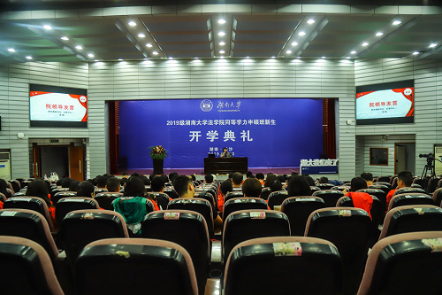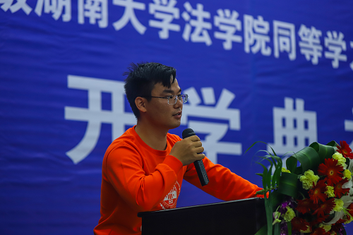 院长助理蒋海松副教授以《读书是一种修行》为题在典礼上致辞。他幽默地从法律角度来诠释开学典礼的意义:“从宪法的角度而言,入学是教育权的落实,从此你们拥有了在湖大的主体资格;从民法的角度,你们将与湖大承担无限连带责任;从诉讼法的角度,入学是法律程序的起点,提醒大家不要超过诉讼时效。从刑法的角度,祝福你们好好享受在校的‘有期徒刑’,早日平安释放”。蒋老师提出,大家不同于懵懂的年少时期,在经历了社会的洗礼之后,重新前来求学,应该不是为了功利的文凭或者虚荣炫耀,更应是出自对知识真诚的渴望、对法治真正的热爱、对大学自由氛围的追寻,对改变命运突破自己的内心向往。蒋老师恳切指出,读书是一场修行,需要自我淬炼,改变自己的习性,读书期间其修行主要表现在四个方面,即“修行法律思维,修行法学体系,修行人格品行,修行综合能力”。蒋老师风趣而不失法律人严谨的发言为同学们带来了最好的“开学第一课”,让同学们深受感染,全场掌声四起。