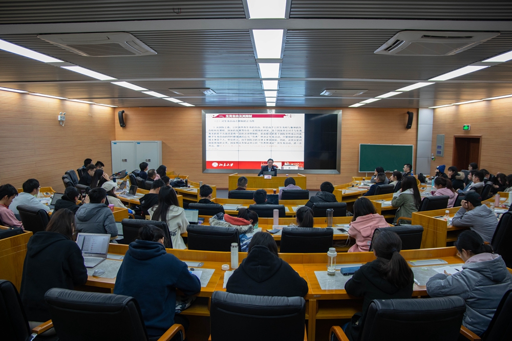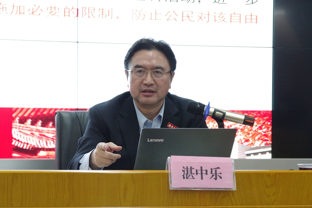 湛中乐教授首先就我国计划生育的基本国策与公民生育自由的冲突展开讲解,表明在实行对公民生育自由进行强力干预的计划生育政策的影响下,使得我国出现了人口劳动力不足、老龄化社会提前到来、人口结构不合理性等人口发展上的问题,并以三个案例“广东公安民警超声辞退事件”、“原华南理工副教授蔡智奇超生开除案”、“陕西安康孕妇强制引产事件”来引发同学们对于生育自由及限制的思考。湛教授指出国内对于生育权的现有研究大多数是围绕民法具体展开的,公法学者的失语使得生育权的讨论无法上升到政府与公民的角度。我国宪法上缺乏对生育权的明确规定,现行《人口与计划生育法》第3章第17条“公民有生育的权利,也有依法实行计划生育的义务,夫妻双方在实行计划生育中负有共同的责任”仅仅具有法律层面保护的意义,应将其上升为宪法层次的保护。随后,湛教授从个人权利、社会层面以及国际法三个角度出发论述对生育自由进行限制的正当性。