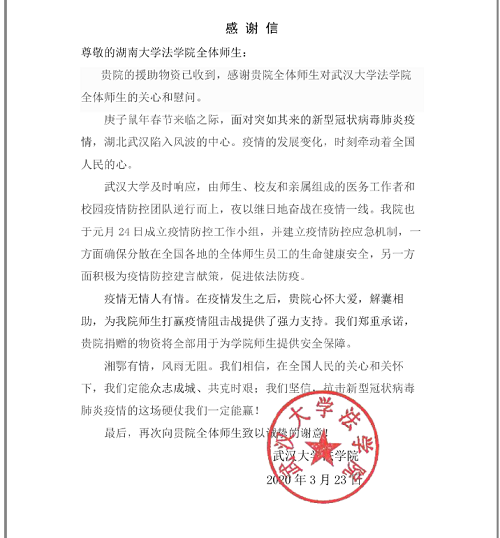 长江之水永不断绝,洞庭湖波情缘相连。吾等坚信,众志成城,绝无难逾之山,心手相牵,可克万难之险。疫散报捷有期,春暖花开在望。匡难扶危,袍泽同心。谨修家书一封,道师生牵挂,携抗疫物资些许,表金兰寸心。