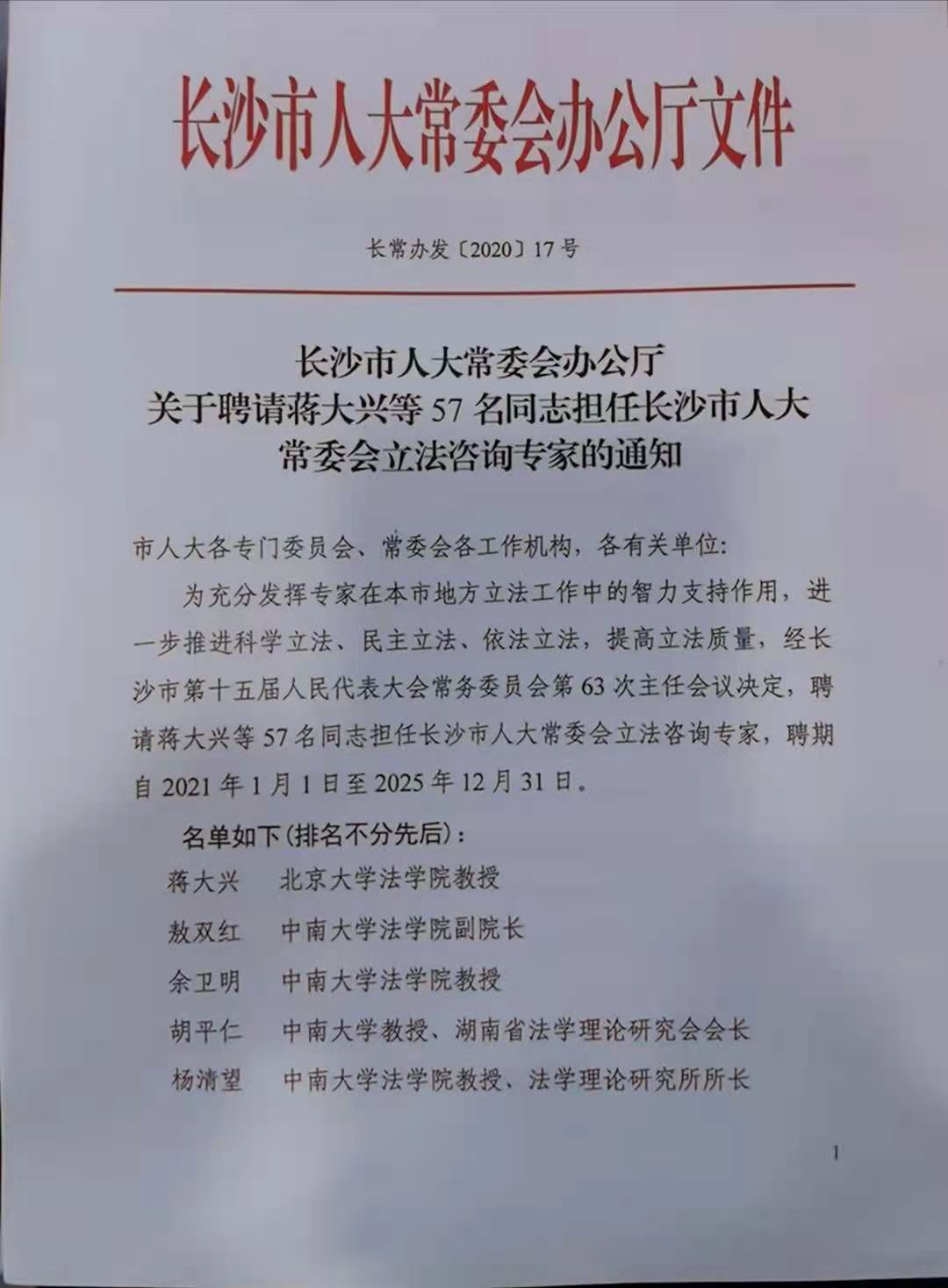 2020年12月21日下午,长沙市人大常委会举行立法咨询专家聘任会,正式聘请57位同志作为市人大常委会新一届立法咨询专家。博彩平台 教师高中、郭哲、唐双娥当选。市人大常委会主任谢卫东为专家颁发聘书并讲话,市人大常委会副主任王国海主持聘任会,市人大常委会秘书长柳美景出席。依托立法咨询工作,专家们可充分发挥专业优势和学术特长,为地方立法提供专业支撑和智力支持。