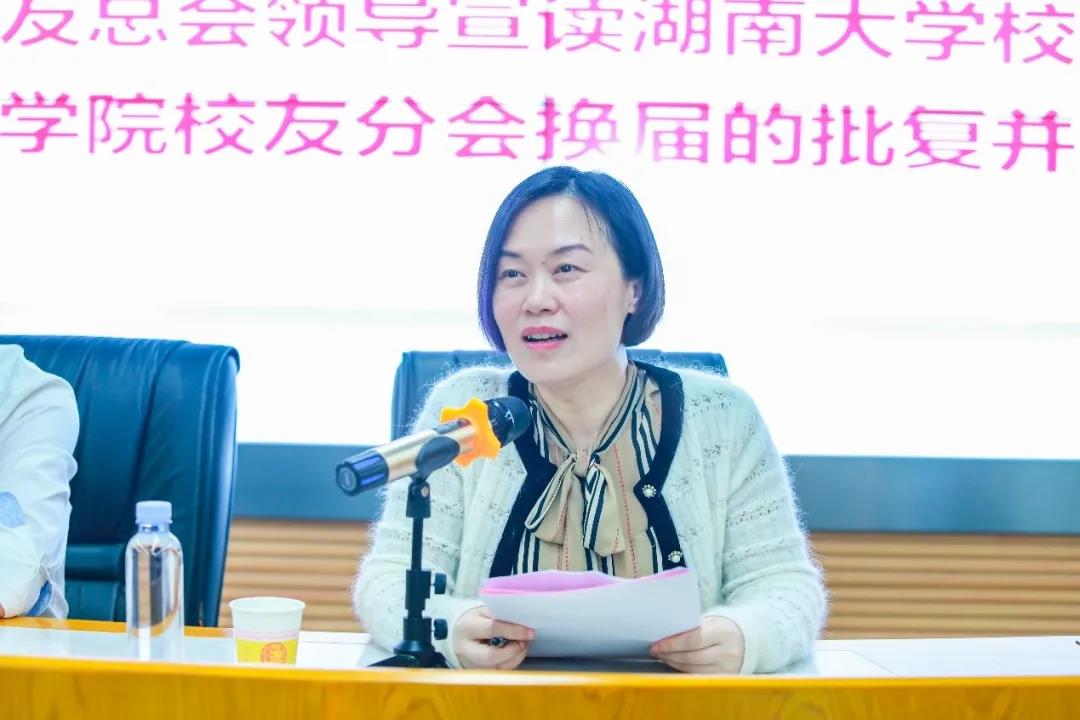 分会建设成为学院与社会外界沟通的桥梁;第二,要能够按照一流标准开展工作,为社会输送更多政治精英、学术精英,加强创新管理,规范管理,发挥表率作用。最后她预祝本次大会圆满成功,祝福各位校友工作顺利、家庭幸福。