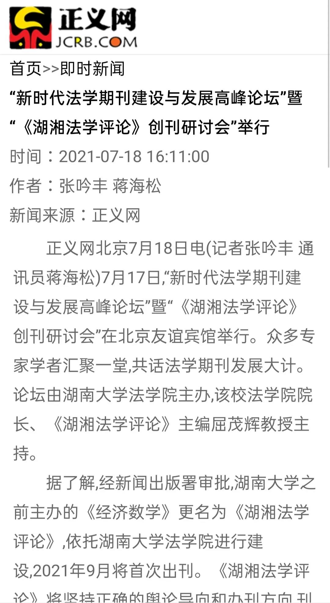 会议的成功召开和《湖湘法学评论》的创刊引发了媒体的高度关注及广泛报道。截止到发稿时为止,已有《光明日报》、人民网-人民资讯、中国新闻网、法治日报—法制网、检察日报-正义网、《法治周末报》、《三湘都市报》、红网、《长沙晚报》为此推出报道。