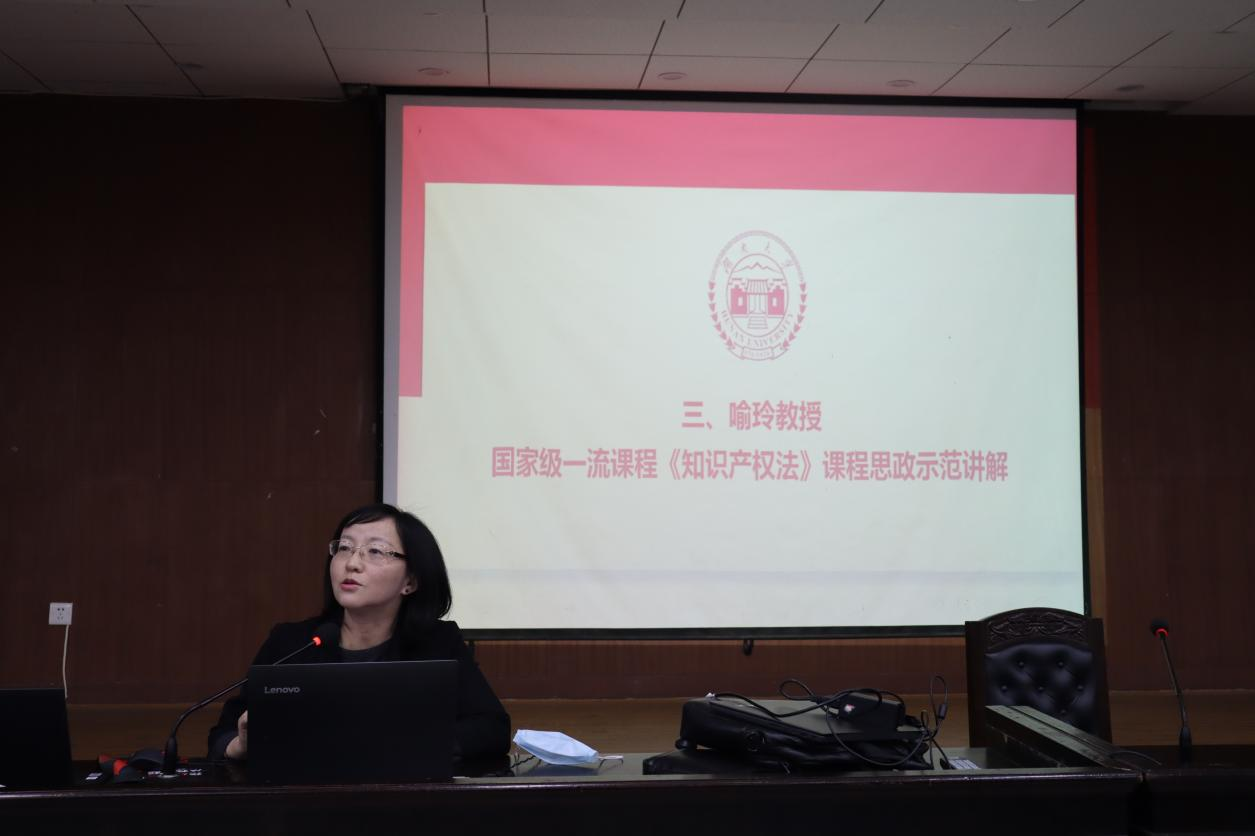 副院长喻玲教授做国家级一流课程《知识产权法》课程思政示范讲解。喻玲老师提出,推进落实好课程思政建设,首先应当以培养德法兼修的法治人才作为教学的切入点和目标。其次注重对教学内容中思政元素的提炼,紧紧围绕课程育人的目标,突出专业精神和法律职业伦理。最后要优化教学方法、激发学生的专业兴趣,注重对学生课堂法律思维的训练,这本身就是在进行课程思政。