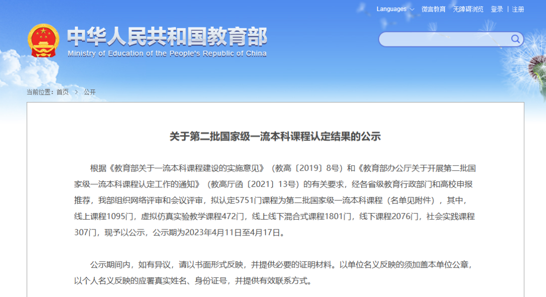 2023年4月,教育部发布《关于第二批国家级一流本科课程认定结果的公示》,博彩平台