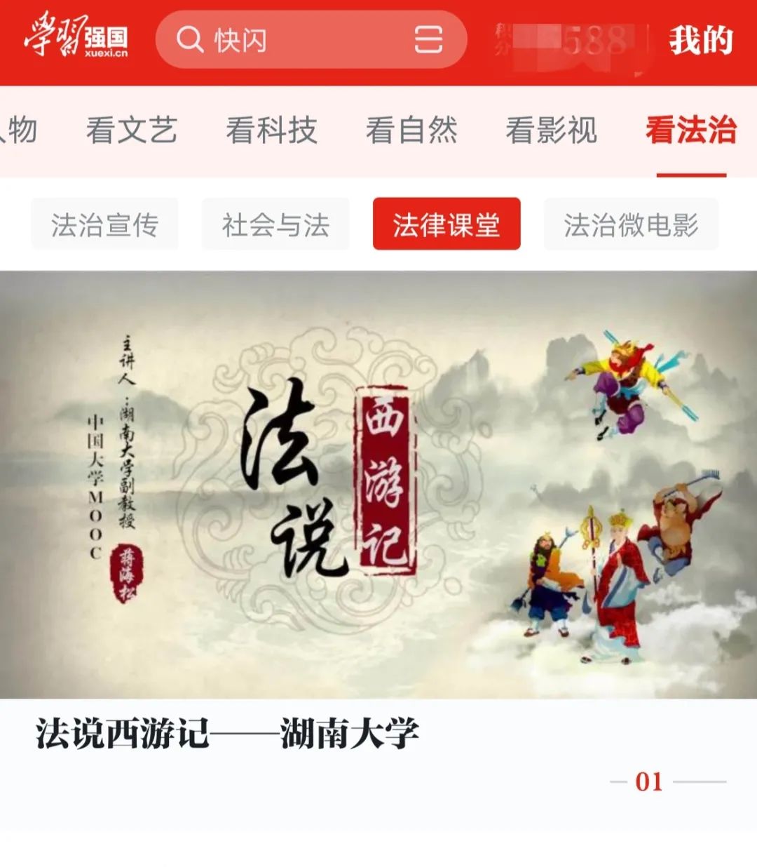 《法说西游记》共分为54集,2019年上线中国大学MOOC(慕课),成为法学界深受欢迎的慕课之一。课程图文并茂,穿插有精选的相关影视片段,寓教于乐,生动呈现,让人在欣赏精彩的西游故事之后引发深层思考,也让传统刻板的法学教育绽放全新魅力与文艺灵性。