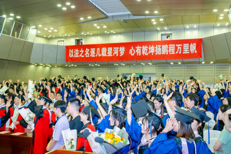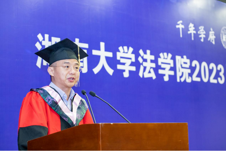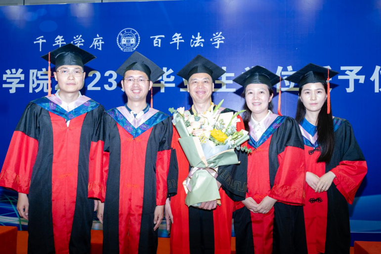2023 年学位授予决定》,对8位法学博士、279位硕士研究生及175位本科生(包括二学位)作出授予学位的决定。随后,屈茂辉、黎四奇、张智辉、谢佑平、肖海军、郑鹏程、高中老师为全体毕业生一一正冠拨穗、颁发证书并合影留念。
