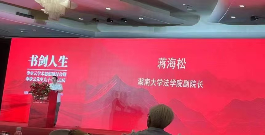 副院长蒋海松发言介绍了他正在创作的《书剑人生法治梦——李步云与他经历的时代》一书的写作进展。蒋海松结合湖大的贺信,以大志、大智、大勇、大情等几个层次致敬了李老的贡献,并结合“李步云传记”中的一些小故事, 以小见大总结了李老的精神。他最后以小联作结“立德立功立言,三不朽铸就法治神话; 大智大勇大情,一生梦只为华夏苍生!"他的激情发言让现场听众深受感染。各位嘉宾也就如何更好创作《李步云传》给蒋老师提供了各方面素材和建议,并期待这一见证中国法治进程的作品早日问世。