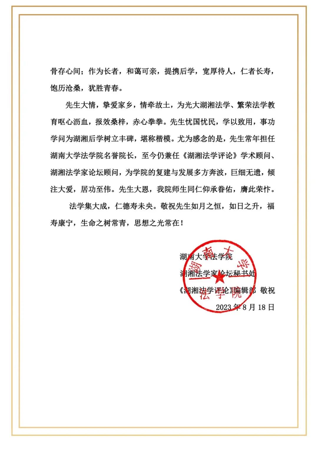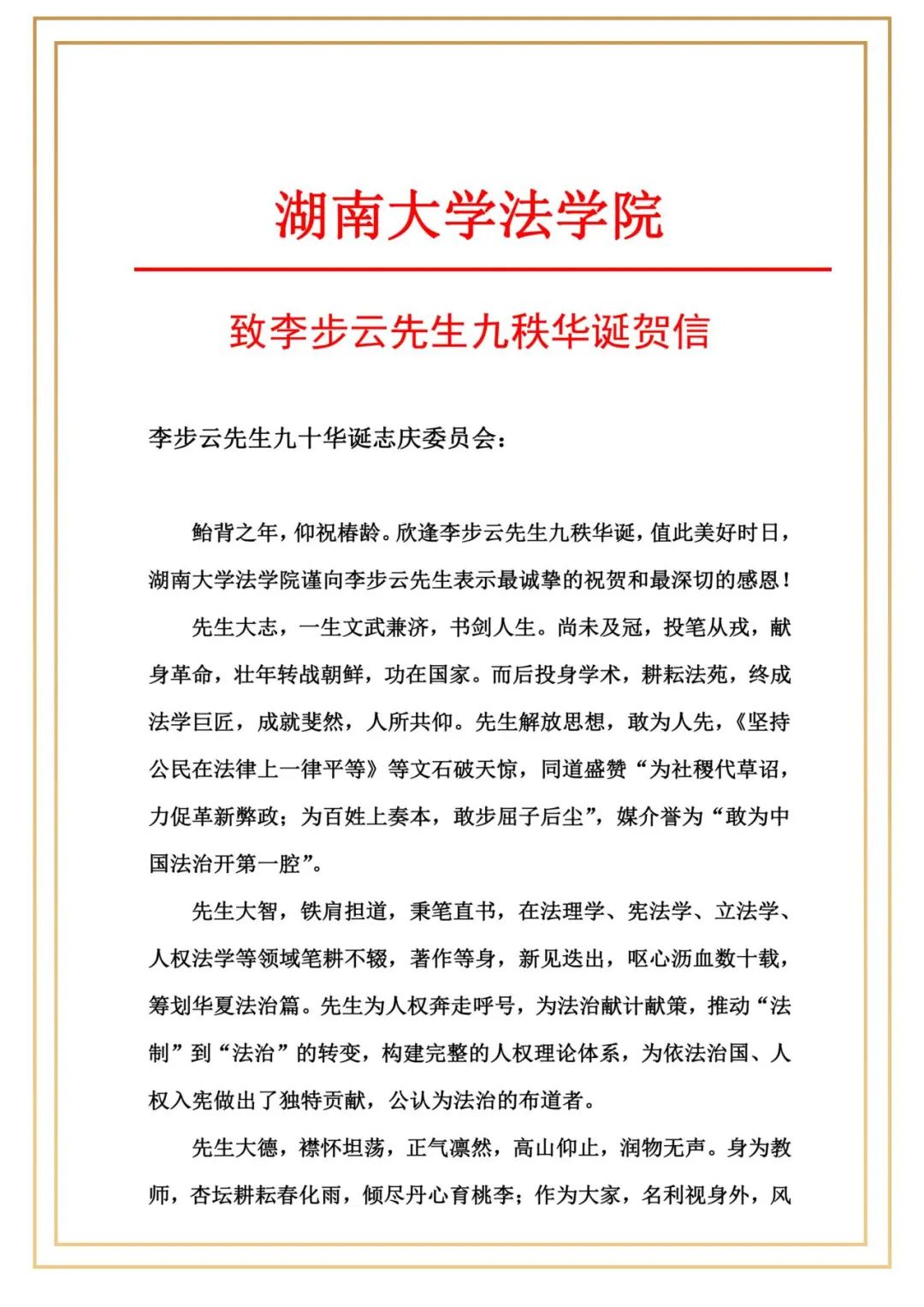 院长刘云生、湘潭大学党委副书记兼法学部部长廖永安等近20位来自各机关领导、院校代表、科研学术机构代表、法学界代表、媒体期刊代表、学生及亲属代表发言,表达对李步云教授的衷心祝福和美好祝愿。