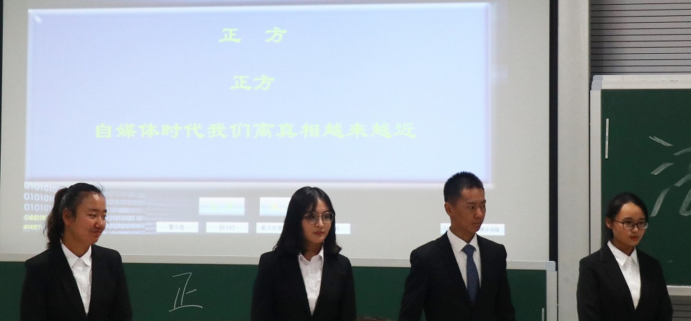 第一场为季军争夺赛,正方持“自媒体时代我们离真相越来越近”观点,反方持“自媒体时代我们离真相越来越远”观点。立论环节,正方提出此次讨论标准为民众是否对真相能有更广泛、更全面、更主动的了解,并从自媒体利于更广泛全面了解真相、自媒体为大众主动发布及接收真相提供平台、自媒体通过信息监督提高了信息准确度三方面论证自媒体时代我们离真相越来越近。而反方则通过自媒体时代下新闻产生低门槛追求爆点且假新闻泛滥、新闻传播中歪曲事实监管困难、新闻接受时信息爆炸难以甄别三个论点来论证在自媒体时代我们离真相越来越远。双方在自媒体时代下谣言是否可以得到有效的遏制上展开了积极交锋。点评环节,苑初琳对双方的比赛进行了客观评价,指出了比赛双方立论清晰、表述明白等优点,同时也指出了双方交战不够大胆、攻击力度不够等不足,并提出了许多具有建设性的建议。最后反方以较为出色的临场与团队配合取得了胜利,正方三辩龚星琦为本场“最佳辩手”。