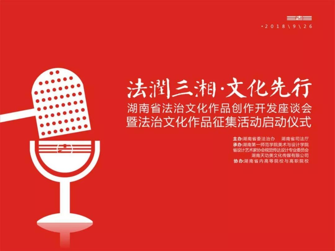 2018926日上午,由湖南省委法治办、湖南省司法厅主办,省设计艺术家协会视觉传达设计专业委员会、湖南第一师范学院和湖南天功美文化传媒共同承办的“湖南省首届法治文化作品创作开发座谈会暨法治文化作品征集活动启动仪式”在湖南第一师范学院隆重举行。