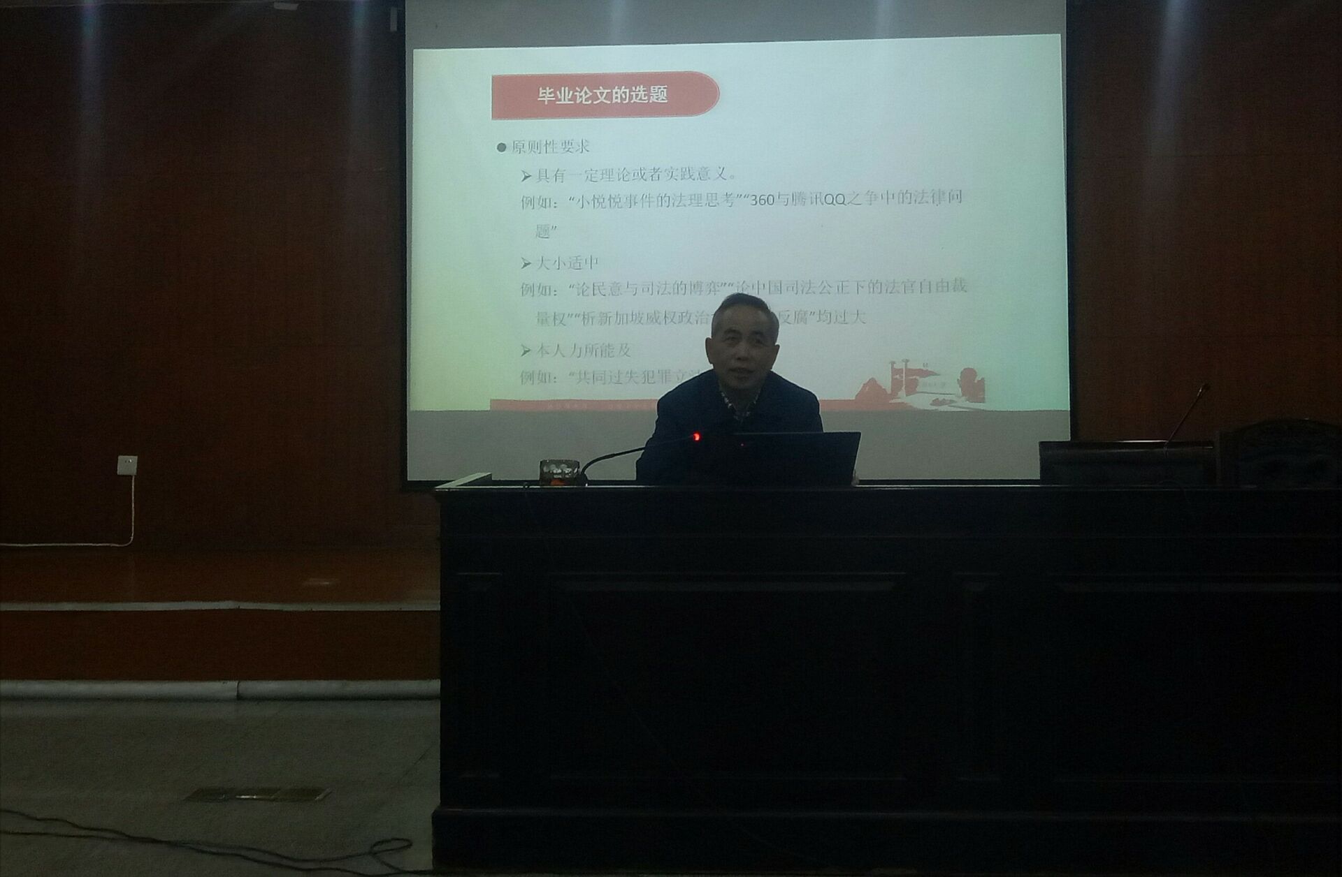院长屈茂辉教授在模拟法庭为2014级法学专业本科生开展毕业论文写作指导专题讲座。2014级法学专业全体本科生参加了此次讲座。