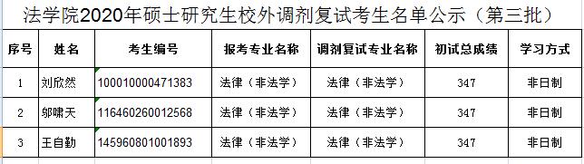根据《博彩平台 2020年硕士研究生复试录取工作实施细则》,经学院研究生招生工作领导小组审定,现将博彩平台 2020年非全日制法律硕士校外调剂复试考生名单(第三批)公示如下,复试时间定于6月9日14:30-16:30,请同学们做好准备(具体请见博彩平台 网站的复试录取工作实施细则及考生复试操作手册)。