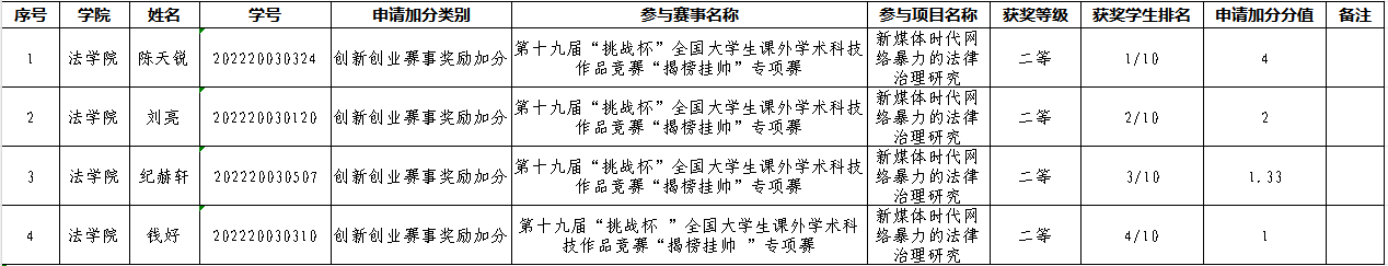 根据《关于开展2026年推免生创新创业赛事、艺术类赛事奖励加分及志愿服务类专项评价成绩认定工作的通知》,经学生个人申请,学院审核汇总,现将拟推荐认定加分情况公示如下: