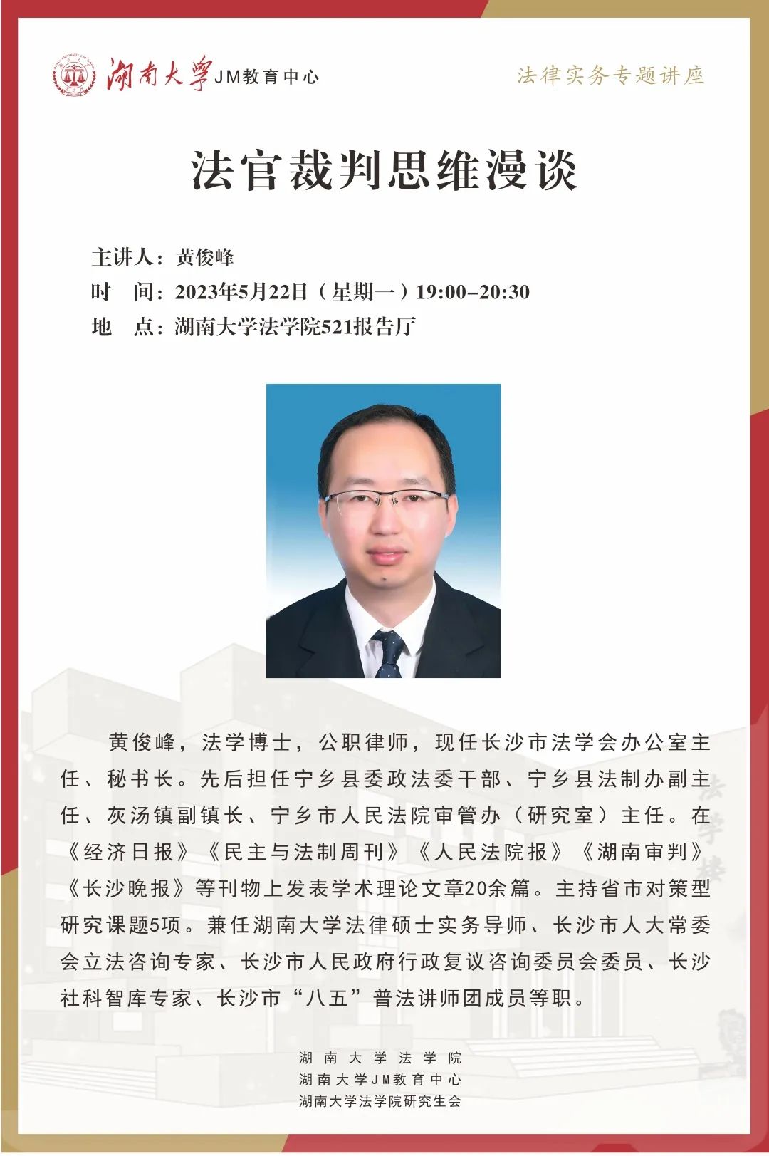 本次JM实务讲座邀请到长沙市法学会办公室主任、秘书长黄俊峰老师为大家讲授法官所要具备的裁判思维。对未来想从事法官职业的同学来说,这将带领大家了解法官执业的真实经历,明确法官裁判思维的特点,区分法官裁判思维与律师执业思维的差异。欢迎同学们积极参与!