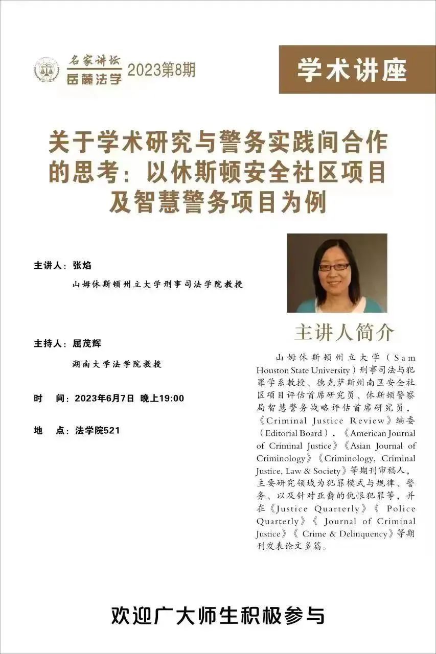 张焰,山姆休斯顿州立大学(Sam Houston State University)刑事司法与犯罪学系教授、德克萨斯州南区安全社区项目评估首席研究员、休斯顿警察局智慧警务战略评估首席研究员,《Criminal Justice Review》编委(Editorial Board),《American Journal of Criminal Justice》 《 Asian Journal of Criminology》《Criminology,Criminal Justice,Law&Society》等期刊审稿人,主要研究领域为犯罪模式与规律、警务、以及针对亚裔的仇恨犯罪等,并在《Justice Quarterly》《 Police Quarterly》《 Journal of Criminal Justice》《Crime& Delinquency》等期刊发表论文多篇。