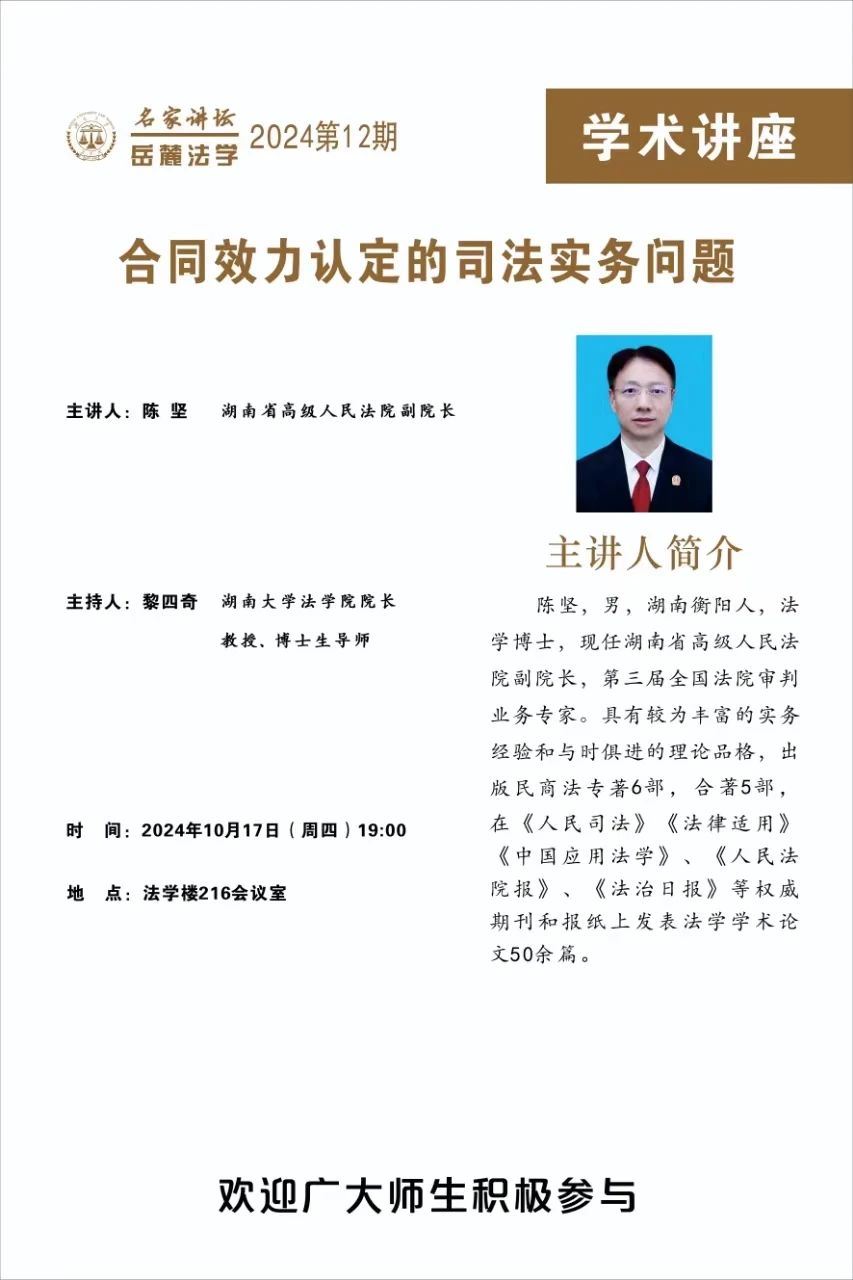 陈坚,男,湖南衡阳人,法学博士,现任湖南省高级人民法院副院长,第三届全国法院审判业务专家。具有较为丰富的实务经验和与时俱进的理论品格,出版民商法专著6部,合著5部,在《人民司法》《法律适用》《中国应用法学》、《人民法院报》、《法治日报》等权威期刊和报纸上发表法学学术论文50余篇。