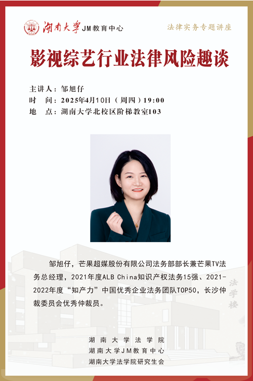 本次JM实务讲座邀请到芒果超媒股份有限公司法务部部长兼芒果TV法务总经理——邹旭仔,为大家讲述影视综艺行业法律风险趣谈,帮助大家了解相关实务问题,欢迎同学们积极参与!