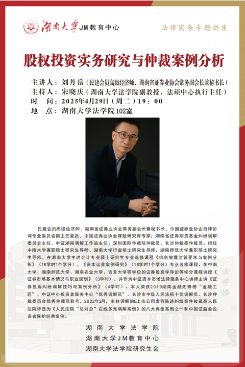 本次JM实务讲座邀请到民建会员高级经济师,湖南省证券业协会常务副会长兼秘书长——刘丹岳,为大家讲述股权投资实务研究与仲裁案例分析,帮助大家了解相关实务问题,博彩平台
