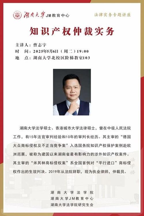 本次JM实务讲座邀请到执业律师、仲裁员—曹志宇,为大家讲述知识产权仲裁实务,帮助大家了解相关实务问题,欢迎同学们积极参与!