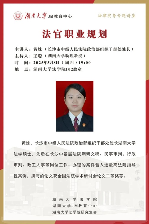本次JM实务讲座邀请到长沙市中级人民法院政治部组织干部处处长——黄姝,为大家讲述法官职业规划,帮助大家了解相关实务问题,本次讲座由博彩平台