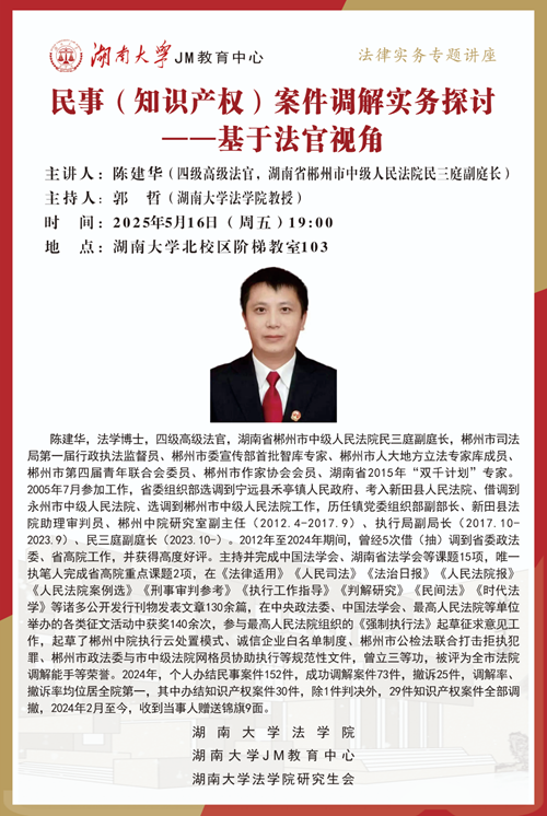 本次JM实务讲座邀请到湖南省郴州市中级人民法院民三庭副庭长、四级高级法官——陈建华,为大家讲述民事(知识产权)案件调解实务探讨——基于法官视角,帮助大家了解相关实务问题,本次讲座由博彩平台
