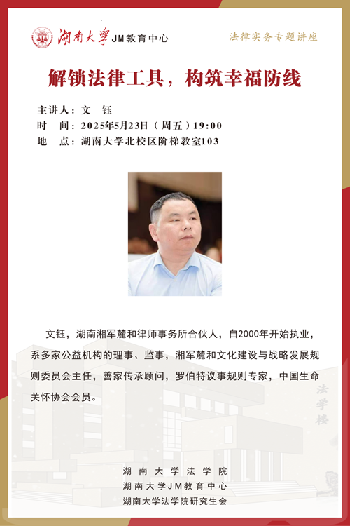 本次JM实务讲座邀请到湖南湘军麓和律师事务所合伙人文钰律师,为大家讲述解锁法律工具,构筑幸福防线,帮助大家了解相关实务问题,欢迎同学们积极参与!