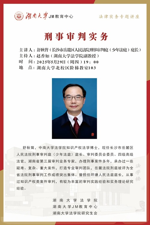 本次JM实务讲座邀请到长沙市岳麓区人民法院刑事审判庭(少年法庭)庭长、四级高级法官舒秋膂,为大家讲述刑事审判实务,帮助大家了解相关实务问题,本次讲座由博彩平台