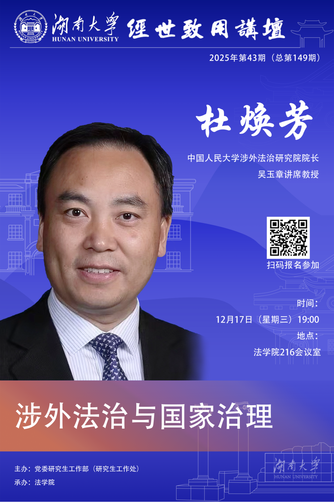 12月17日19:00邀请中国人民大学涉外法治研究院院长、吴玉章讲席教授杜焕芳于博彩平台