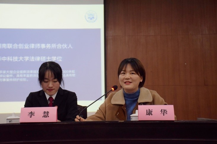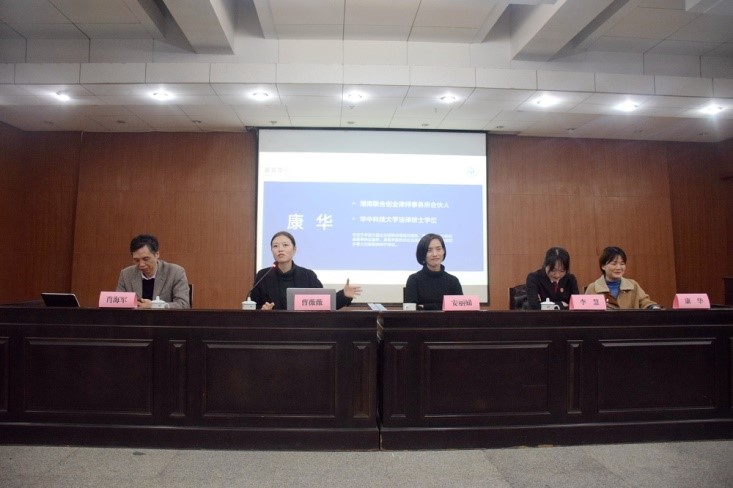与谈环节中,湖南昌言律师事务所主任安丽娣讲述她的所思所感,指出律师业务的复杂性、社会中对于女性能力的偏见、女性更多的家庭责任等原因助推了女性在律师行业中的从业困境,但她也强调女性应当客观对待职业初期的困难与矛盾,充分认识女性的优势,发挥自己的长处。随后,长沙市雨花区人民法院李慧法官分享了自己作为女法官的一些有趣经历,鼓励同学们学好专业知识,用实力打破这种职业困境。紧接着,湖南联合创业律师事务所合伙人康华律师分享了自己曾经遭遇到的挑战,指出只有找准自己的职业意义和价值,才能获得职业成就感。对于与谈人提出的 “个人能力大于性别”的观点,曹薇薇教授从社会对于女性价值认知的角度作出了回应。