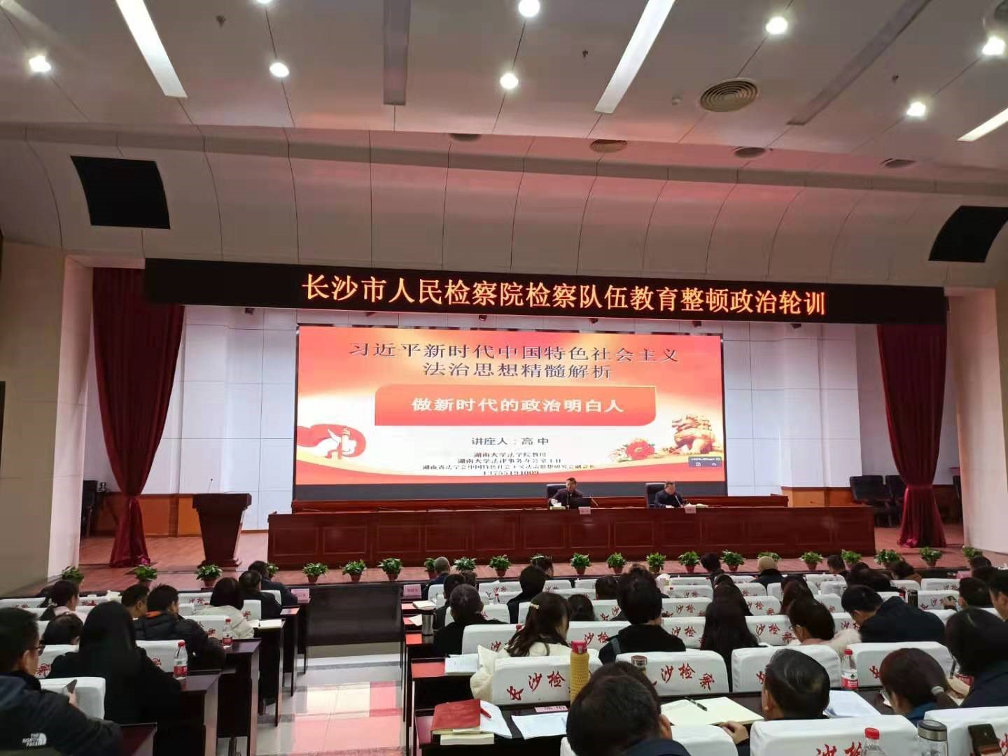 2021年3月11日高中教授受邀给长沙市人民检察院专题讲授习近平法治思想。长沙市人民检察院包括王勋爵检察长在内的院班子成员、驻院督导组领导成员及全体干部出席聆听了本次讲座。高中教授结合检察工作实际,从“作新时代政治明白人”的角度,剖析了习近平法治思想的合理内核,对该院全体干部深入贯彻习近平法治思想具有启发意义,受到一致好评。