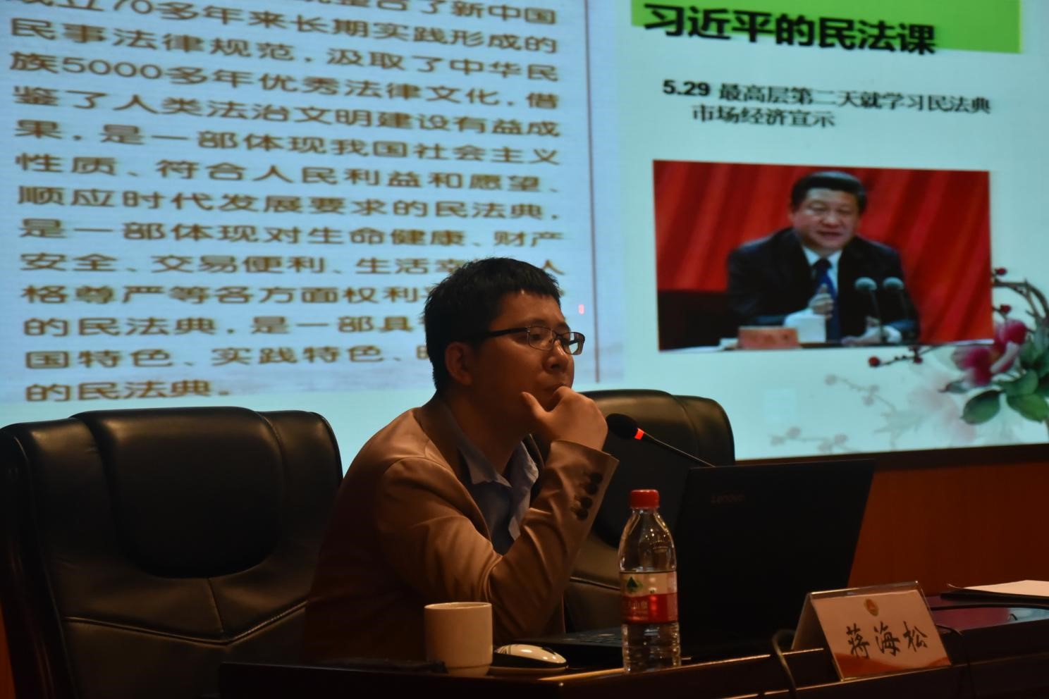 蒋老师从新定位、新突破、新自信、新变革、新起点等不同方面展示了习近平法治思想的创新。他介绍道,习近平法治思想系统深刻回答了新时代为什么实行全面依法治国、怎样实行全面依法治国等一系列重大问题,是新时代全面依法治国的指导思想、根本遵循、行动纲领,是新时代法治中国建设取得更大成就的思想旗帜。检察机关作为国家的法律监督机关,肩负着保障法律统一正确实施的重要职责,是坚持建设德才兼备的高素质法治工作队伍的重要组成部分。他倡导,检察机关围绕贯彻落实习近平法治思想,依法履行法律监督职责,切实担负起维护公平正义的检察使命。