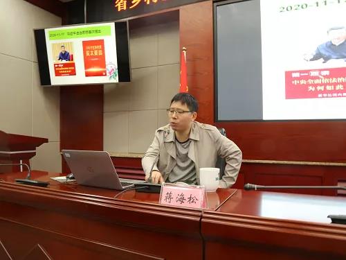 副院长、80后青年学者蒋海松作习近平法治思想和《中华人民共和国乡村振兴促进法》专题辅导报告。蒋海松分析指出,出台乡村振兴促进法是落实习近平法治思想的重要举措,乡村振兴促进法是实施乡村振兴战略的法治基石。乡村振兴促进法是第一部以乡村振兴命名的基础性、综合性法律,聚焦增加农民收入、提高农民生活水平、提升农村文明程度等核心任务,对乡村振兴的总目标、总方针、总要求作出明确规定,把实施乡村振兴战略必须遵循的重要原则、重要制度、重要机制固定下来,是促进乡村振兴一部打基础、管长远、固根本的大法。蒋海松从乡村振兴促进法切入,围绕习近平法治思想,从“新高度”“新布局”“新突破”“新自信”“新变革”“新起点”六个方面,以图文并茂形式,结合理论与实际,全面回顾了习近平法治思想的提出过程,总结了习近平法治思想的基本精神、核心要义和实践要求,对习近平法治思想的实践逻辑、理论逻辑和历史逻辑等进行了深入分析和生动阐释。