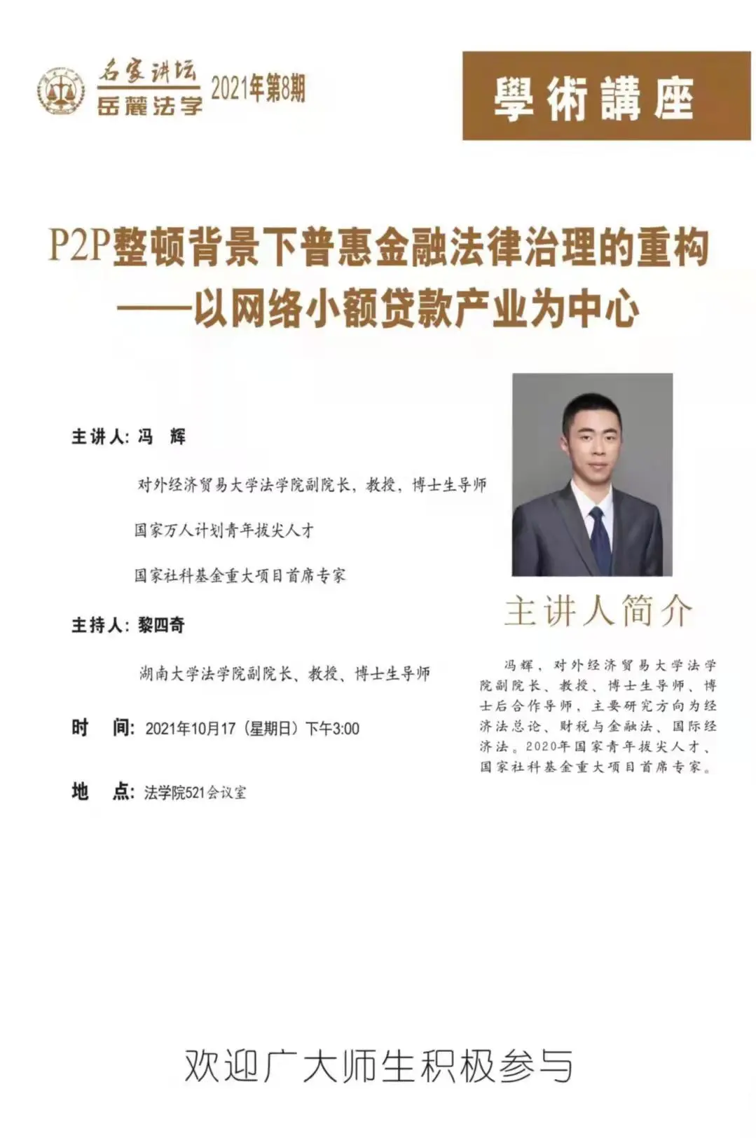 521会议室带来以“P2P整顿背景下普惠金融法律治理的重构——以网络小额贷款产业为中心”为主题的精彩的学术讲座。此次讲座由博彩平台