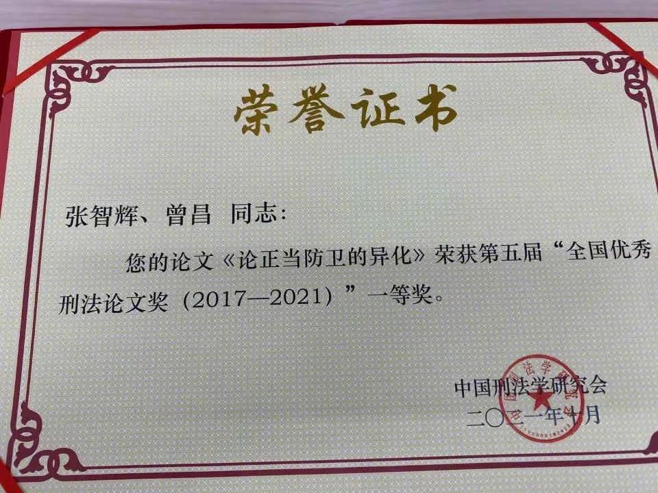 张智辉教授、曾昌博士研究生合著《论正当防卫的异化》一文被评为第五届全国优秀刑法论文奖(2017-2021)一等奖,博彩平台