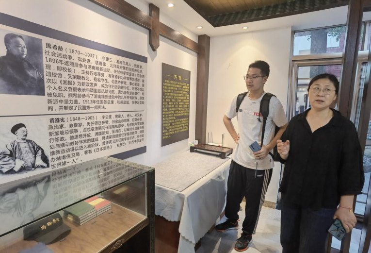 故址志愿者刘力老师热心为同学们担任解说员。“天倪庐”进门右侧是“时务学堂旧址陈列馆”,馆内陈列着时务学堂的沿革历史与杰出师生的事迹。步入时务学堂陈列室,扑面而来的便是无边震撼。谭嗣同,蔡锷,黄遵宪,一个个在近代史上留下印记的名字,原来他们与这湖南第一所新式学堂竟有着如此渊源。时务学堂当时的老师方阵堪称“教授天团”。梁启超任中文总教习,李维格任西文总教习。李维格曾留学英国,后协助盛宣怀办理洋务,后专力经营汉阳铁厂与汉冶萍煤铁矿公司,为我国钢铁工业的先驱之一。中文分教习为韩文举、叶觉迈、欧榘甲、唐才常;西文分教习为王史、许应垣;数学教习许奎垣;舆地分教习邹代钧;体操分教习杨福严。这些分教习也是一时之翘楚。