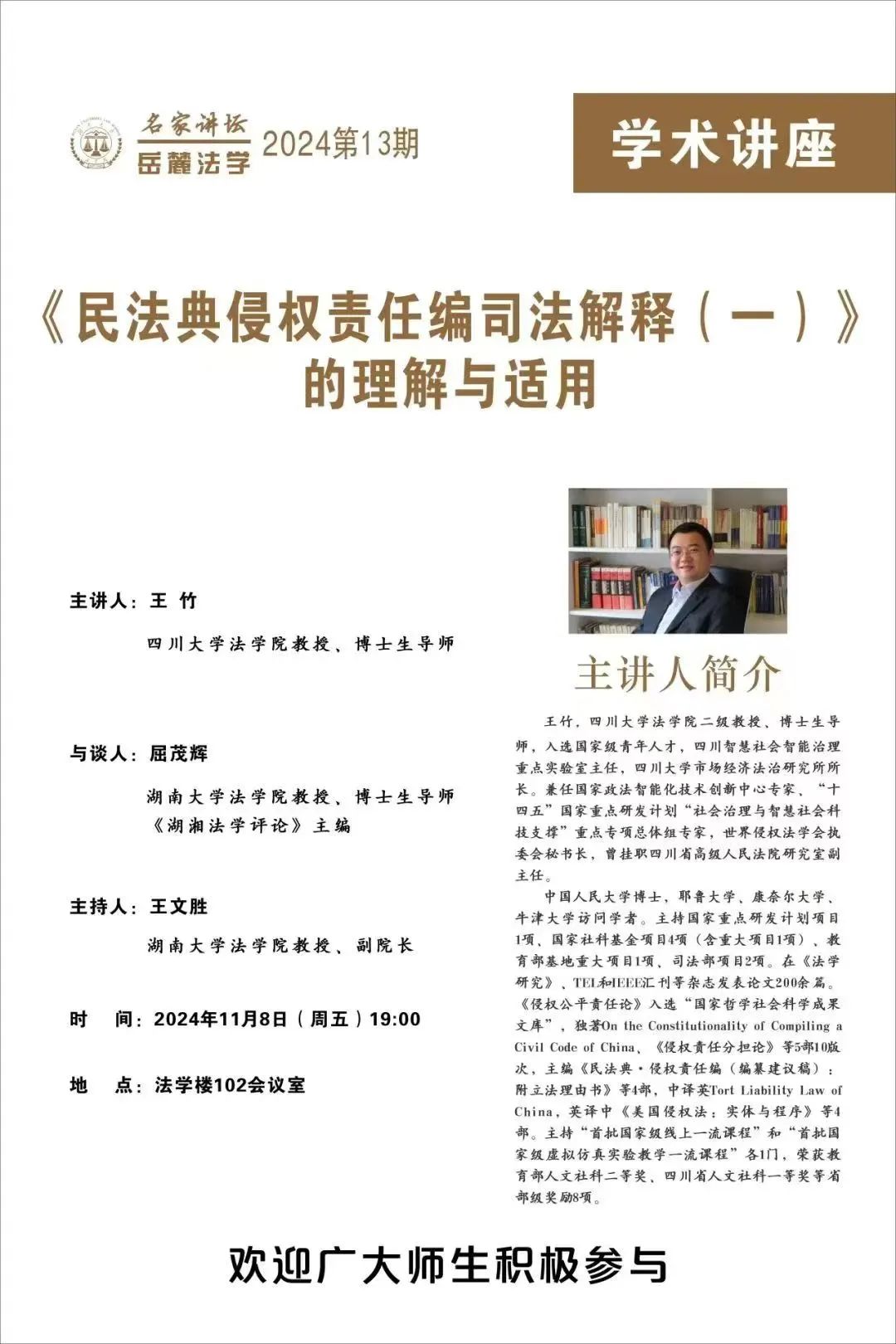 102会议室隆重举行。四川大学王竹教授应邀做了关于“《民法典侵权责任编司法解释(一)》的理解与适用”的讲座。本期讲坛由博彩平台