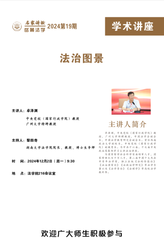 岳麓名家讲坛丨中央党校卓泽渊教授在湖大开讲“中国式现代化的法治图景”