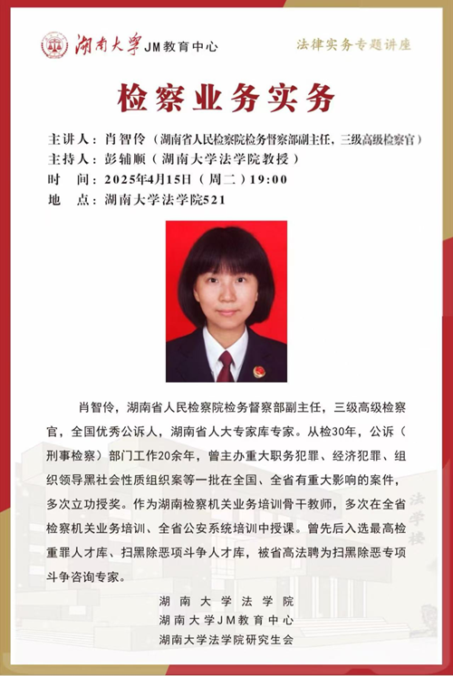 2025年4月15日19:00,湖南省人民检察院检务督察部副主任,三级高级检察官肖智伶在湖大521教室开讲“检察业务实务”,博彩平台