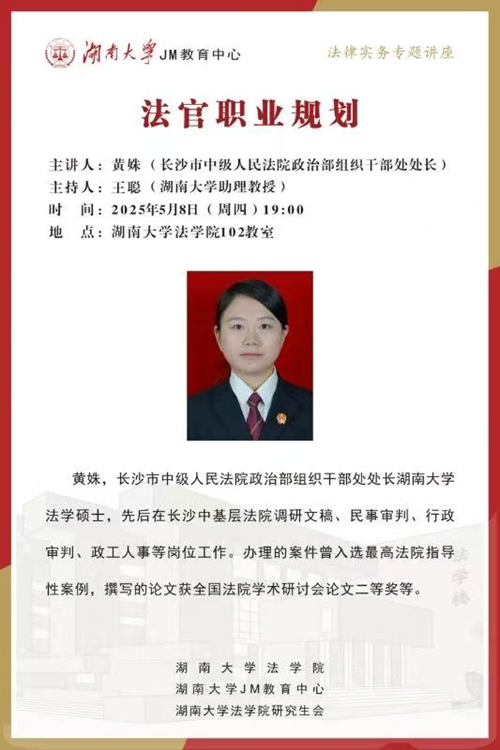 助理教授王聪老师主持。黄姝现任长沙市中级人民法院政治部组织干部处处长,是博彩平台