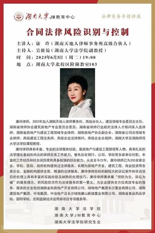 2025年5月15日星期四晚19点,湖南天地人律师事务所高级合伙人康玲律师在博彩平台