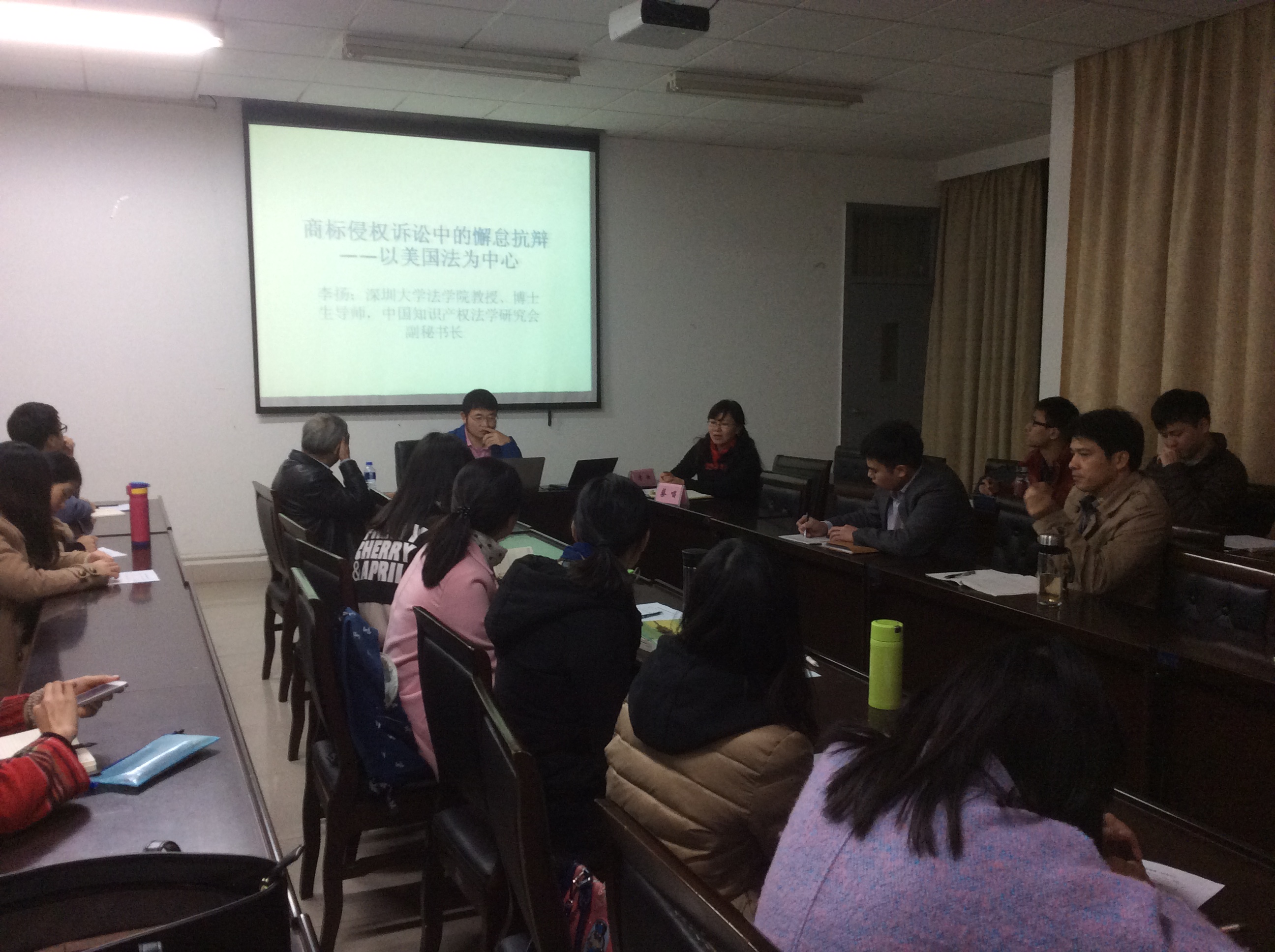 教授蔡唱作为主持人与会。此次讲座,李扬教授以美国法为依据,结合多年来搜集的判例,对商标侵权诉讼中的懈怠抗辩进行了深刻的剖析,其观点与法有据,引起了在座老师和同学们的强烈共鸣。