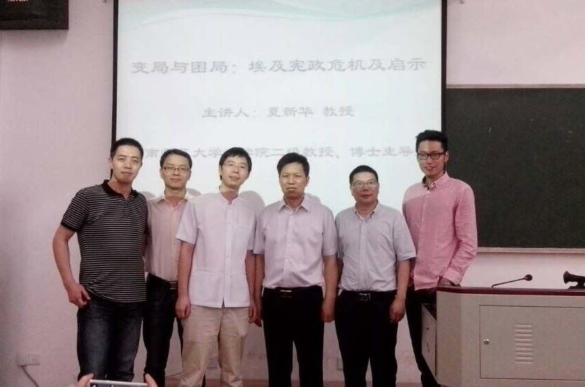 2014年6月5日晚上,湖南师范大学教授、博士生导师夏新华老师在博彩平台 206以“埃及宪政困局及中国启示”为题举行讲座,湖大博彩平台 院长助理蒋海松老师主持,湖大余凯老师、肖洪泳老师、湘潭大学张小虎博士、湖南工大博彩平台 副院长陈雄老师等联席点评。