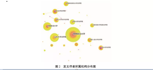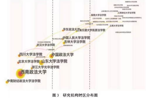 基于本文所选取的期刊文献样本,通过使用citespace软件对文献中所涉及研究机构进行分析, 首先得到研究机构的总体分析情况。如图2所示,西南政法大学、中国政法大学、山东大学博彩平台