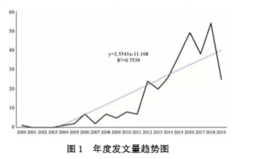 通过对中国知网中检索所得的期刊文献按年度进行统计,结果如图1所示。根据发文量的年度分布数据所构建的线性方程系数为正,R方值为0.7539。这一结果表明,基于裁判文书法学实证 研究成果的数量与时间序列成正相关,就总体趋势而言,随着时间的推进,基于裁判文书的实证研究成果数量也随之增长。然而,如若对发文量在具体年份的分布情况进行观测,在总体增长趋势之下,基于裁判文书法学实证研究成果数量变化仍可以划分出较为明显的三个阶段:第一阶段为2000 年至2011年,该阶段中,研究成果数量呈缓慢增长趋势,年度发文量较少,且年度增长率较低;第二阶段为2012年至2017年,与第一阶段末的2011年发文量相比,本阶段初2012年的发文量得到明显提升,并且,本阶段中的2013至2016年之间的发文量以较高的年度增长率明显高于第一阶段;第三阶段,即2019年,本年度发文量与第二阶段末的2018年发文量相比急剧下降。