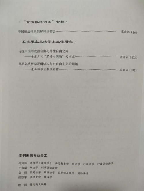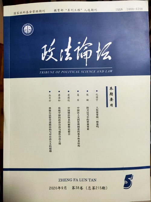 蒋海松副教授在法学CSSCI、CLSCI《政法论坛》第5期发表论文《传统中国的政治自由与德性自由之辩——牟宗三对“黑格尔问题”的回应》,该文章入选当期封面论文。