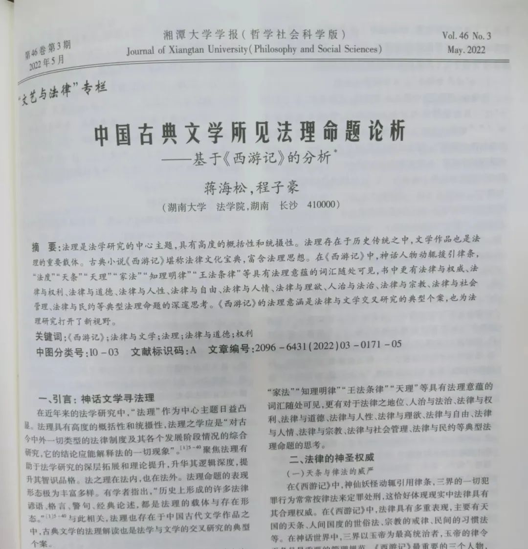 副教授蒋海松与硕士研究生程子豪在CSSCI来源期刊《湘潭大学学报(哲学社会科学版)》2022年第3期发表论文《中国古典文学所见法理命题论析——基于<西游记>的分析》。