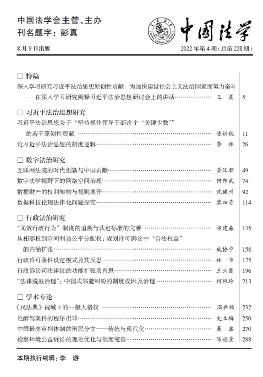 《中国法学》是中国法学会主管、主办的法学学术期刊,创刊于1984年,是国家社科基金重点资助的优秀期刊;连续三届获得“全国百强报刊奖”;连续四届获得国家期刊奖(或提名奖);在各类评价体系中,影响因子长期稳居全国法学期刊排名榜首;是中国法学界最具影响、最具权威的学术期刊。