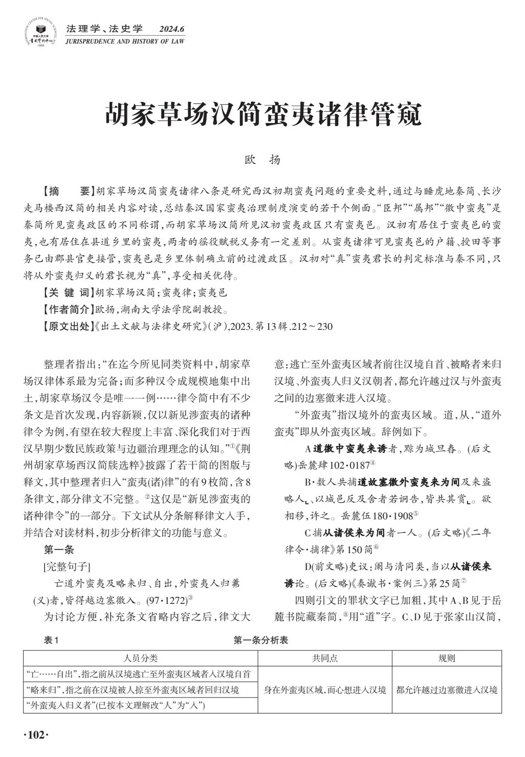 欧扬副教授的论文《胡家草场汉简蛮夷诸律管窥》被人大复印报刊资料《法理学、法史学》2024年第6期全文转载。